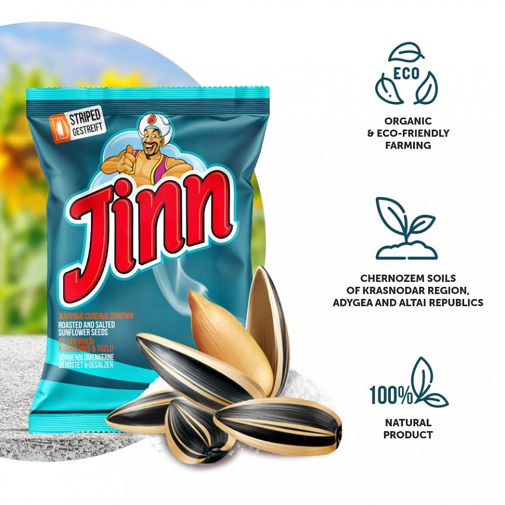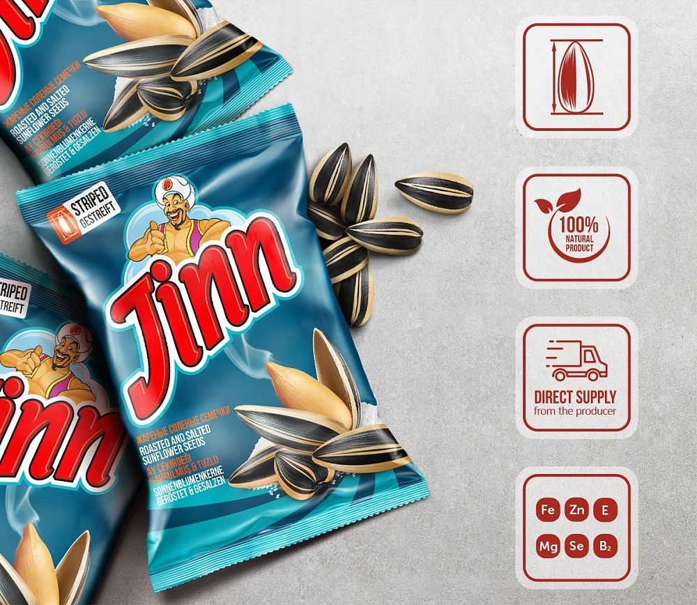 Size does matter when it comes to Jinn Striped salted sunflower seeds. A product for those who will settle for nothing less than the best.
