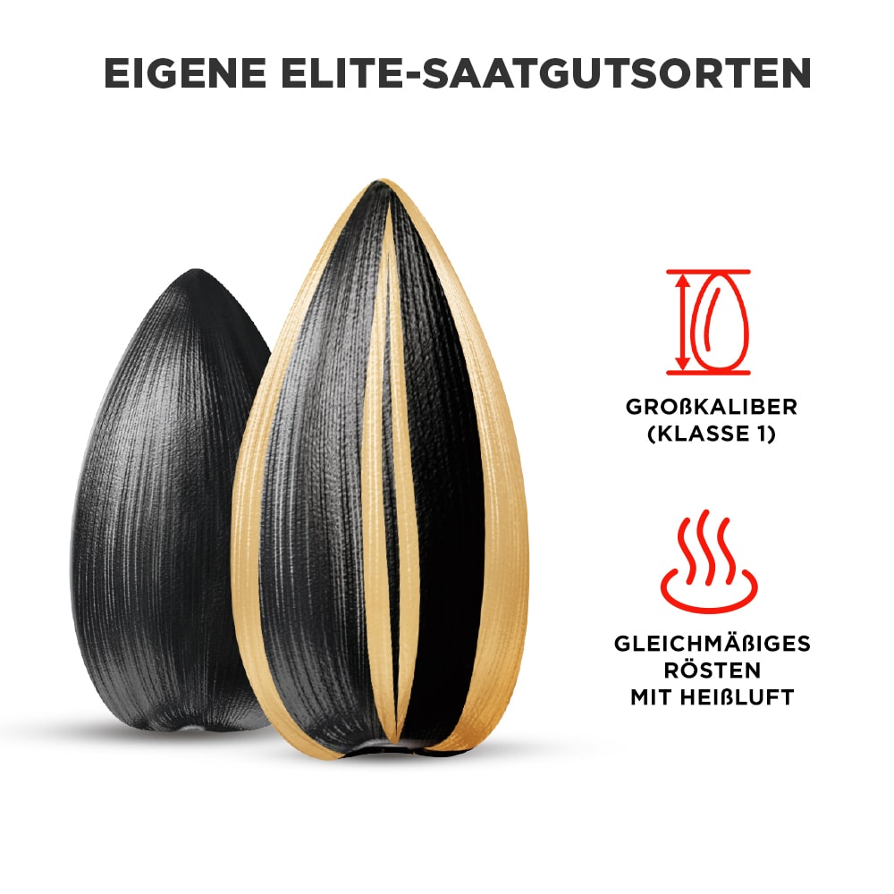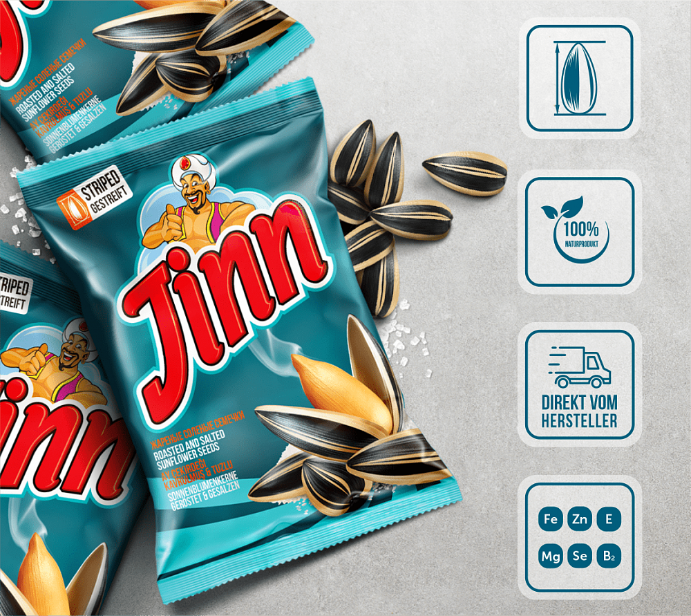 Bei gesalzenen «Jinn Striped» - Sonnenblumenkerne kommt es auf die Größe an. Ein Angebot für alle, die nur das Beste gewohnt sind.